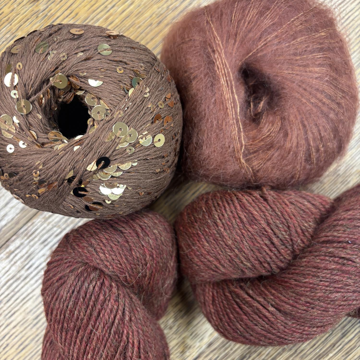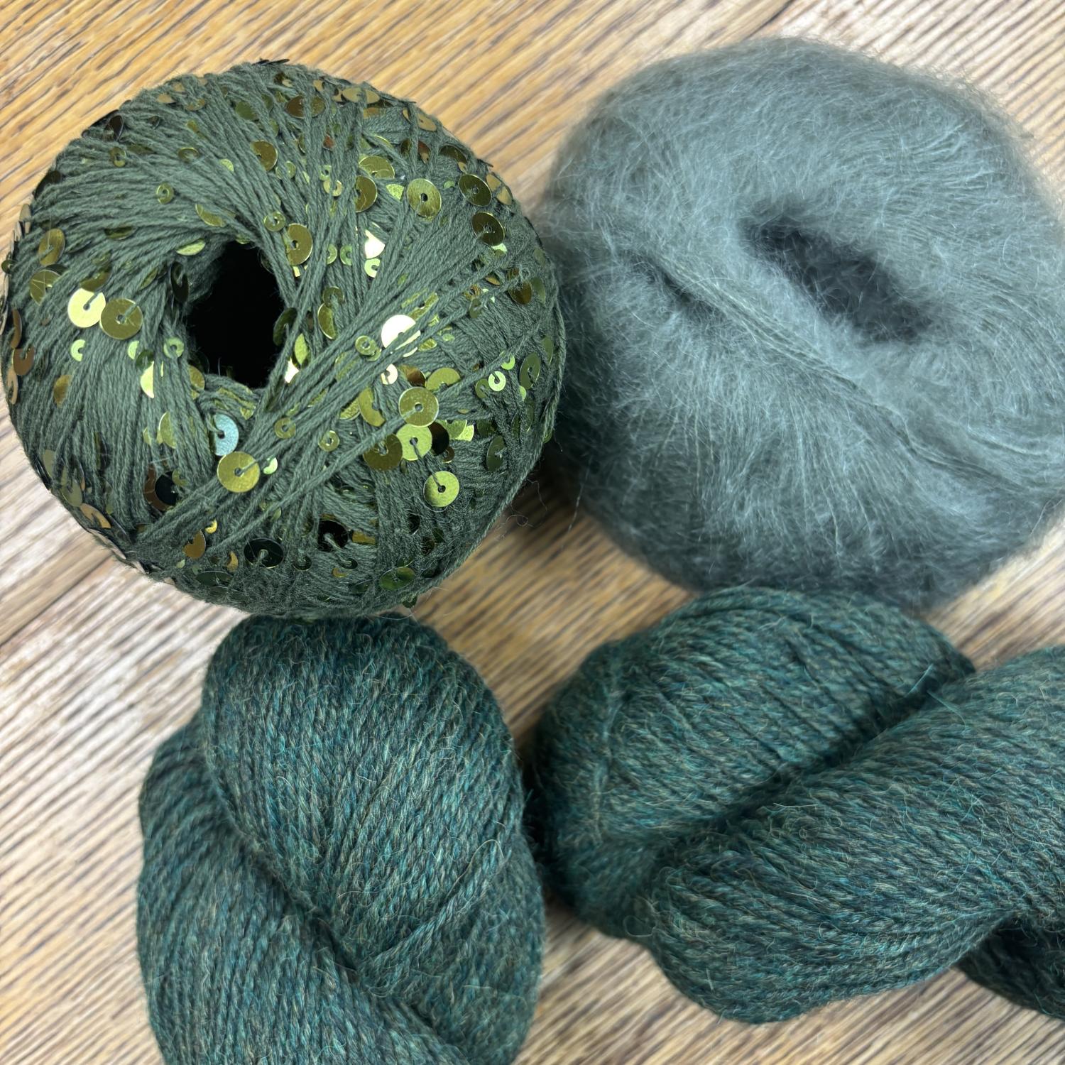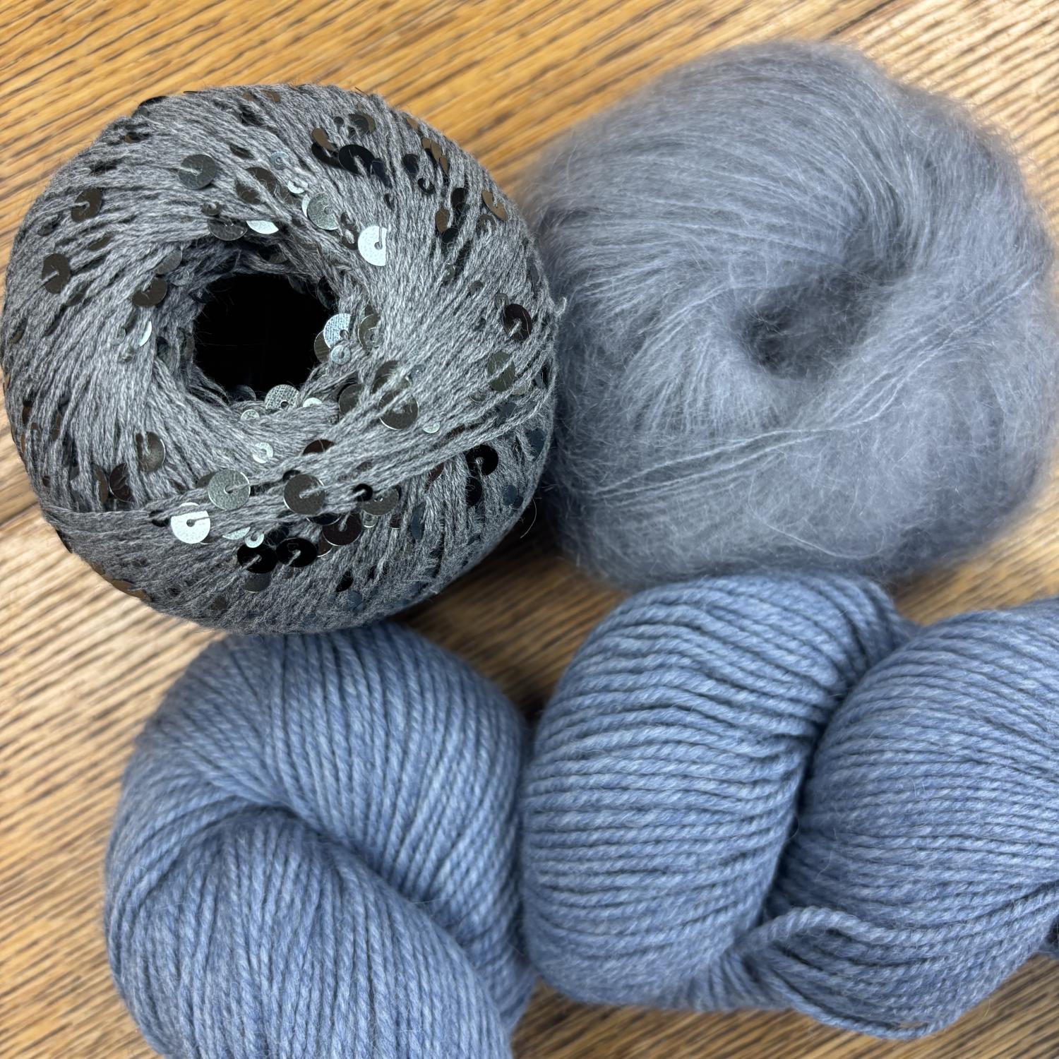 - 1 ball Lana Grossa Cosmo, 1 ball Rowan Kidsilk Haze, 2 hanks Berroco Ultra Alpaca