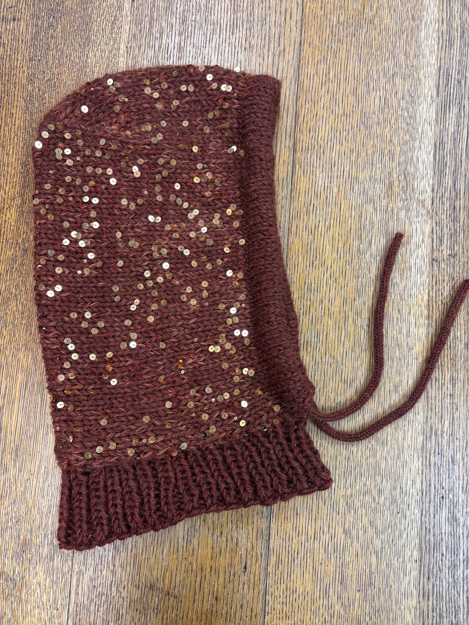 An in house design by the owner, Katie, features an enclosed draw string caseing, soft alpaca yarn, and extra sparkle! Quick to knit on size US #11 needles and perfect to add a little twinkle to all your winter outings.